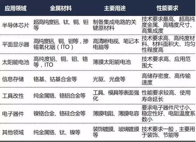 濺射技術作為薄膜材料制備的主流工藝,其應用領域廣泛,如集成電路、平板顯示器、太陽能電池、信息存儲、工具改性、光學鍍膜、電子器件、高檔裝飾用品等行業。高純濺射靶材則主要用于對材料純度、穩定性要求更高的領域,如集成電路、平板顯示器、太陽能電池、記錄媒體、智能玻璃等行業。